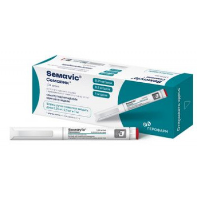 Режим дозирования: Начальная доза препарата Семавик® составляет 0,25 мг 1 раз в неделю. После 4 недель применения дозу следует увеличить до 0,5 мг 1 раз в неделю. Для дальнейшего улучшения гликемического контроля после как минимум 4 недель применения препарата в дозе 0,5 мг 1 раз в неделю, дозу можно увеличить до 1 мг 1 раз в неделю. Доза препарата Семавик® 0,25 мг не является терапевтической. Не рекомендуется введение более 1 мг в неделю. Препарат Семавик® может применяться в виде монотерапии или в комбинации с одним или более гипогликемическими препаратами (см. раздел «Клиническая эффективность и безопасность»). При добавлении препарата Семавик® к предшествующей терапии метформином и/или тиазолидиндионом, или ингибитором SGLТ2 терапию метформином и/или тиазолидиндионом, или ингибитором SGLТ2 можно продолжить в прежних дозах. При добавлении препарата Семавик® к проводимой терапии производным сульфонилмочевины или инсулином следует предусмотреть снижение дозы производного сульфонилмочевины или инсулина с целью снижения риска возникновения гипогликемий (см. раздел «Особые указания»). Применение препарата Семавик® не требует проведения самоконтроля концентрации глюкозы крови. Самостоятельный мониторинг концентрации глюкозы в крови необходим для коррекции дозы сульфонилмочевины и инсулина, особенно в начале лечения препаратом Семавик® и при снижении дозы инсулина. Рекомендуется использовать поэтапный подход к снижению дозы инсулина. Пропущенная доза: В случае пропуска дозы препарат Семавик® следует ввести как можно быстрее в течение 5 дней с момента запланированного введения дозы. Если продолжительность пропуска составляет более 5 дней, пропущенную дозу не нужно вводить. Следующую дозу препарата Семавик® следует ввести в обычный запланированный день. В каждом случае пациенты могут возобновить их обычный однократный еженедельный график введения. Применение препарата в особых клинических группах пациентов: Пациенты пожилого возраста (>65 лет): Не требуется коррекции дозы в зависимости от возраста. Опыт применения семаглутида у пациентов в возрасте 75 лет и старше ограничен. Пациенты с печёночной недостаточностью: Не требуется коррекции дозы у пациентов с печёночной недостаточностью (см. раздел «Фармакокинетика»). Опыт применения семаглутида у пациентов с печёночной недостаточностью тяжёлой степени ограничен; применение препарата Семавик® у таких пациентов противопоказано. Пациенты с почечной недостаточностью: Не требуется коррекции дозы у пациентов с почечной недостаточностью. Опыт применения препарата у пациентов с терминальной стадией почечной недостаточности отсутствует; применение препарата Семавик® у таких пациентов противопоказано. Дети и подростки: Применение препарат Семавик® у детей в возрасте до 18 лет противопоказано в связи с отсутствием данных по эффективности и безопасности. Способ применения: Препарат Семавик® применяют 1 раз в неделю в любое время, независимо от приёма пищи. Препарат Семавик® вводят п/к в живот, бедро или плечо. Место инъекции может изменяться без коррекции дозы. Препарат Семавик® нельзя вводить внутривенно и внутримышечно. При необходимости день еженедельного введения можно менять при условии, что интервал времени между двумя инъекциями составляет не менее 3-х дней (> 72 часов). 