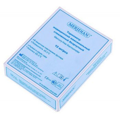 Термометр медицинский безртутный марки MERIDIAN® предназначены для измерения температуры тела человека. Область применения – в лечебных учреждениях, на дому для личного пользования. Принцип действия термометров основан на тепловом изменении объема термометрической жидкости в зависимости от температуры тела человека. Конструкция: термометр состоит из капиллярной трубки с резервуаром, заполненным термометрической жидкостью - сплав металлов (галлий, индий и олово). Капиллярная трубка защищена стеклянной оболочкой, внутрь которой вставлена шкала для отсчета температуры. Термометрическая жидкость абсолютно безопасна, не требует специальных условий к утилизации. Пластмассовый футляр предотвращает механическое повреждение термометра. Промежуточная упаковка запаяна в плотную пленку, что позволяет предотвратить разлив термометрической жидкости и порчу остального товара.